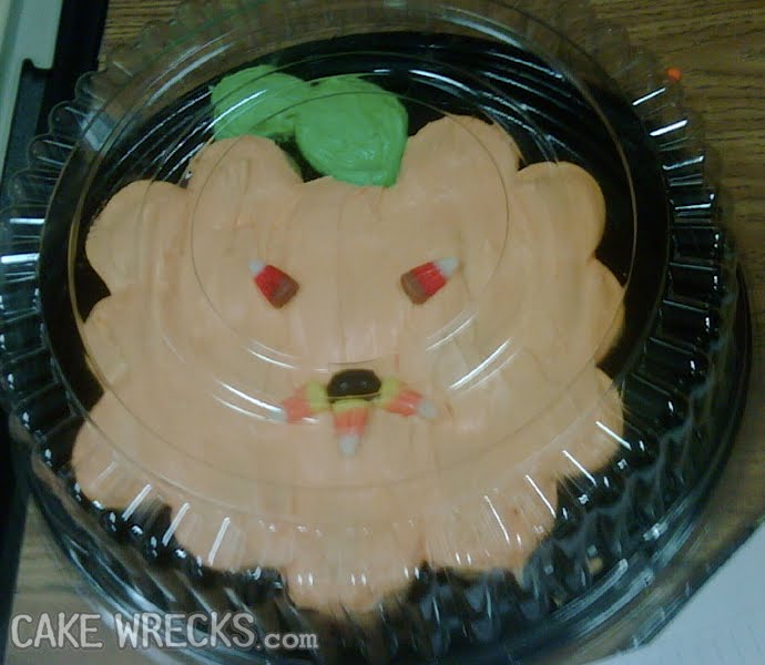 What the...what IS that? Come on, seriously, there's no way you could make this thing look less like a pumpkin!Hm. Maybe the problem lies in trying to make the whole cake look like a pumpkin. Maybe if the baker just drew a pumpkin ON the cake...
